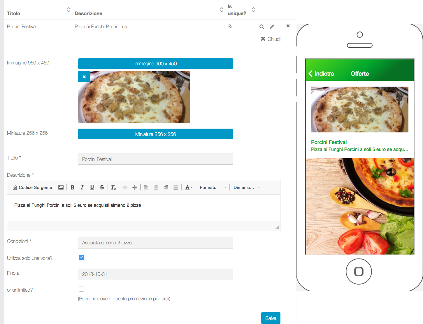 • Data di fine sconto o offerta illimitata. Scegliere se lo sconto avrà una scadenza o sarà illimitato. L’opzione “illimitato” potrà essere disabilitata dal gestore, in qualsiasi momento.